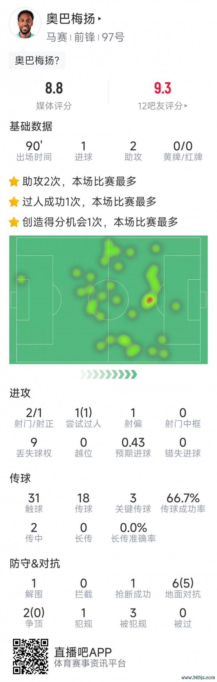 10月1日讯 在本轮欧冠,马赛4-0大捷阿贾克斯。本场比赛奥巴梅扬1球2助攻,以下为他在本场数据: