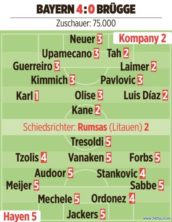 10月23日讯 在本轮欧冠,拜仁4-0大捷布鲁日。《图片报》也对拜仁球员本场弘扬作念出评分,具体如下(德媒评分1分最高,5负最低):