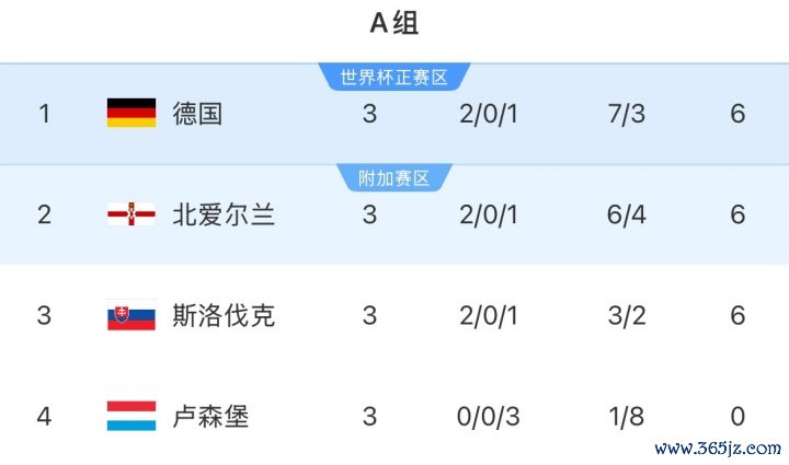 德国、北爱尔兰和斯洛伐克均2胜1负,三队同积6分。卢森堡三连败垫底。