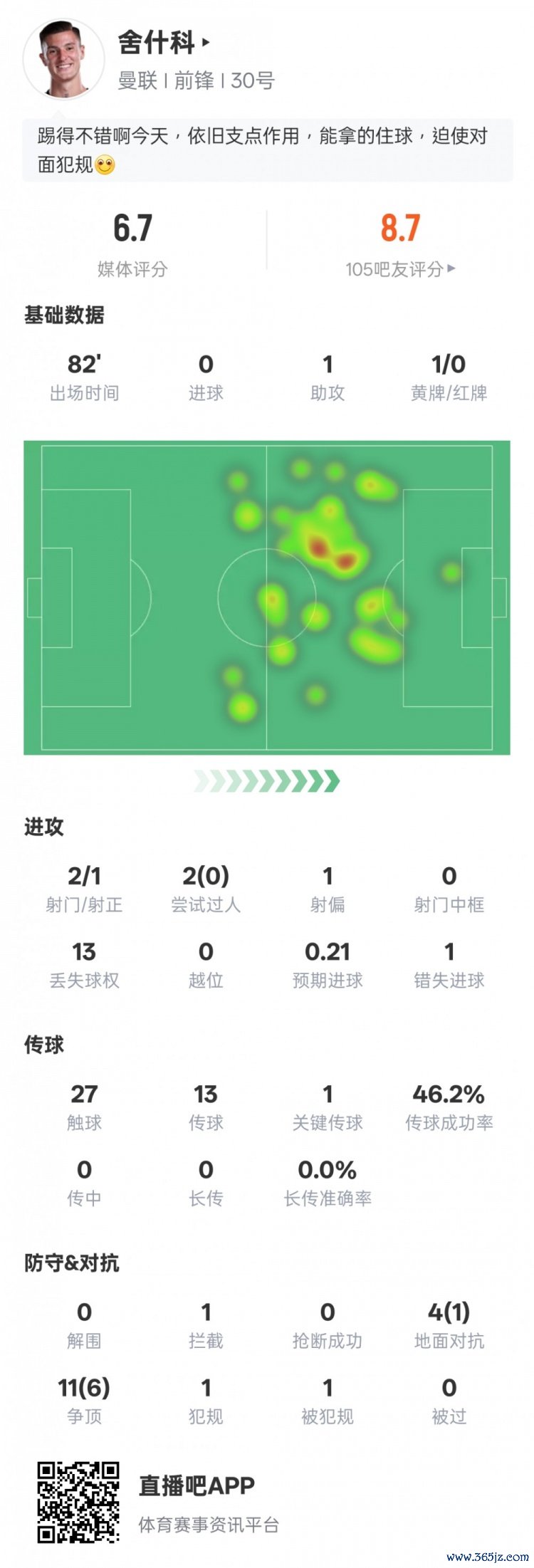 10月26日讯 2025-26赛季英超第9轮,曼联主场迎战布莱顿。舍什科先发出战,送出1次助攻,1次环节传球,也错失1次进球契机,评分6.7。