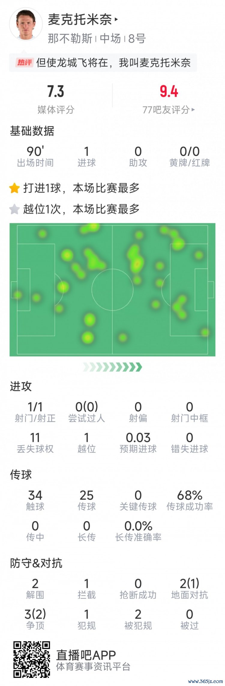 10月26日讯 在本轮意甲,那不勒斯3-1打败国米,以下为麦克托米奈本场数据: