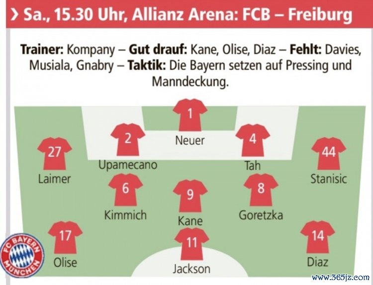 11月22日讯 拜仁将在本轮德甲焦点战镇守主场对阵弗赖堡,德媒《慕尼黑日报》也瞻望了拜仁首发。
