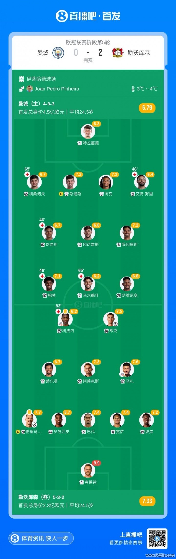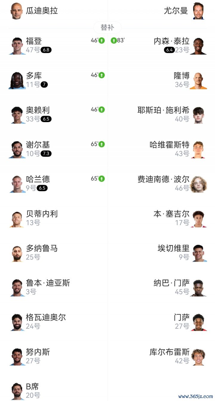 本场曼城大幅交替出战,首发11东谈主中仅有冈萨雷斯是惯例首发,其余10东谈主均为惯例替补。