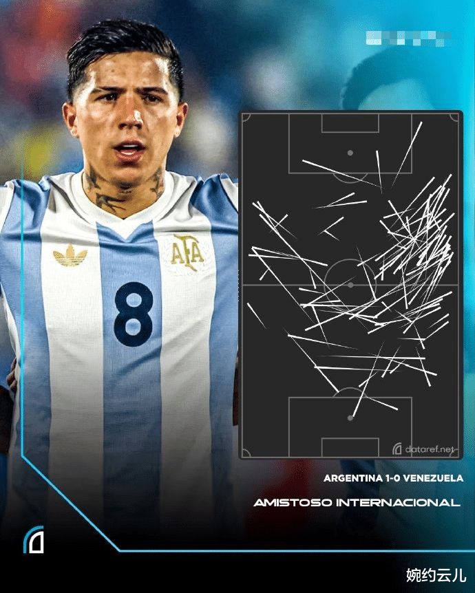 比赛进行到第11分钟右路下底倒三角传球几乎助攻洛塞尔索破门,仅仅这场比赛恩佐繁密要害传递中的缩影。他7次长传4次精确找到队友,3次传中尝试不休拉扯委内瑞拉的边路遏止,更在遏止端完成3次到手大地抵挡与1次突围,完好诠释了 攻防一体 的当代中场性情。在帕雷德斯略显保守的搭档下,恩佐的上前传递成为冲突密集遏止的要害钥匙。也正是他主导的中场交替,让阿根廷得以在前场酿成无间压制,为锋线创造出15次射门契机。7.8分的赛后评分,正是对这种隐形统率力中场的证明。