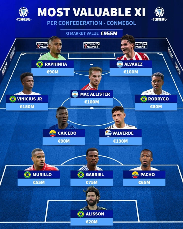 直播吧10月16日讯德转清点了南好意思足联球员的最高身价威望,整套威望总价值高达9.55亿欧元。其中皇马边锋维尼修斯以1.5亿欧元成为身价最高的球员,巴尔韦德以1.3亿欧元紧随自后。