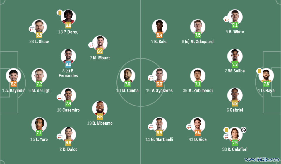 曼联(3421):1-巴因迪尔;15-约罗,4-德里赫特,23-卢克肖(80’5-马奎尔);20-达洛特(55’16-迪亚洛),18-卡塞米罗(65’25-乌加特),8-B费,13-多古;19-姆伯莫,7-芒特(65’30-谢什科);10-库尼亚