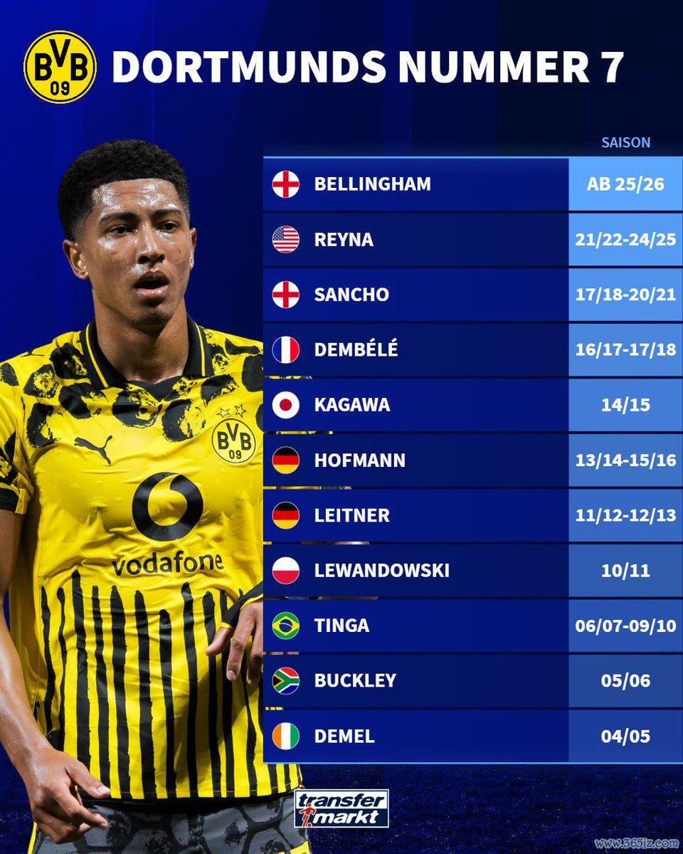 北京技巧8月7日,多特俱乐部官方发布公告,文书乔布-贝林厄姆将在新赛季接过球队的7号球衣,随后,德国转会市集列出了近20年身穿多特7号球衣的球员。
