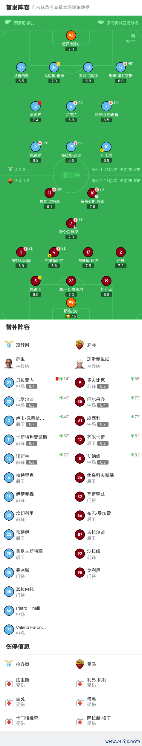 第37分钟,塔瓦雷斯误差,苏莱助攻佩莱格里尼破门,罗马1-0拉皆奥