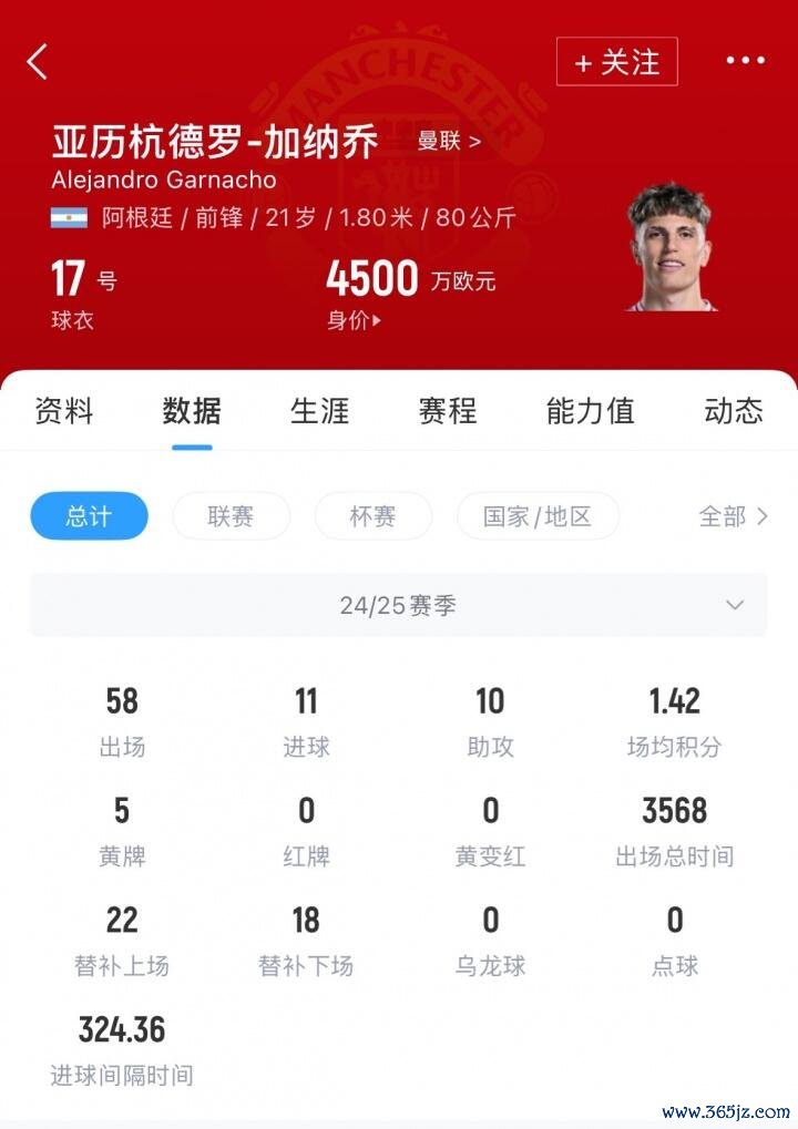 加纳乔现年21岁,上赛季各赛事出场58次,孝顺11球10助。现在球员德回身价为4500万欧元。