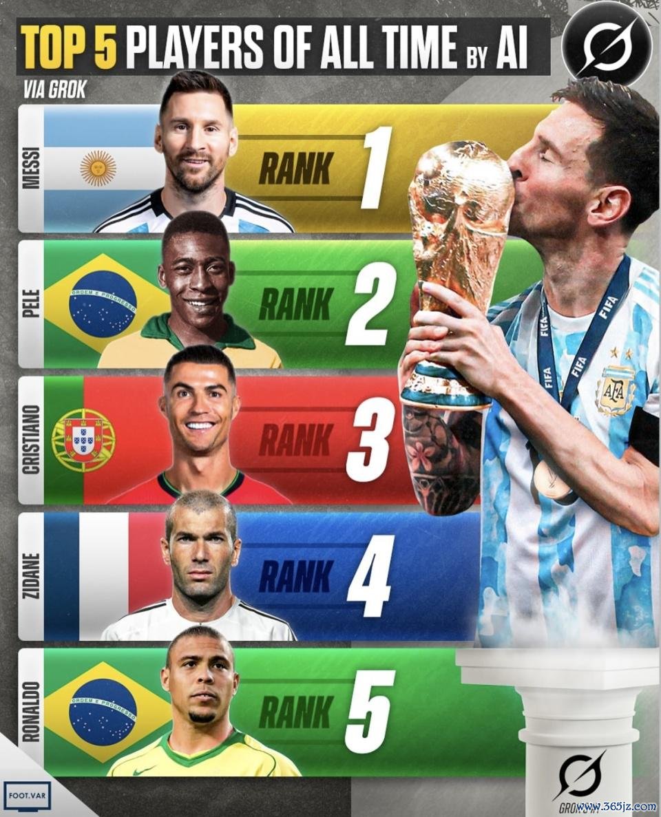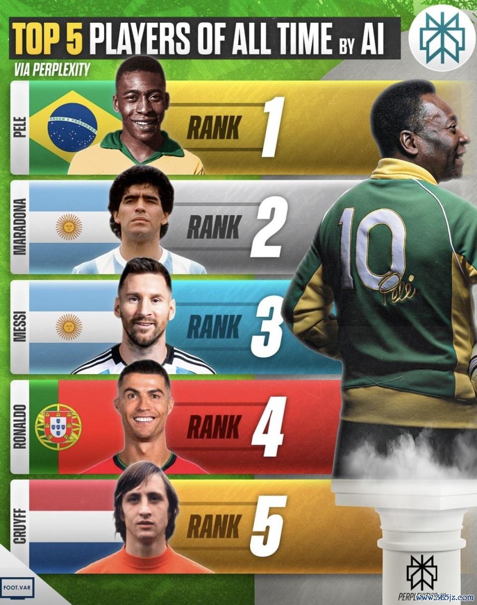 近日,国外足球媒体汇总发布了四家AI平台(ChatGPT、Perplexity、Grok、Gemini)评比的“史向前五球员”名单。从这四份榜单看,梅西、贝利与C罗简直酿成相识共鸣,果然的不对集中在“第五东说念主”之争——、克鲁伊夫与罗纳尔多(大罗)步骤上榜。