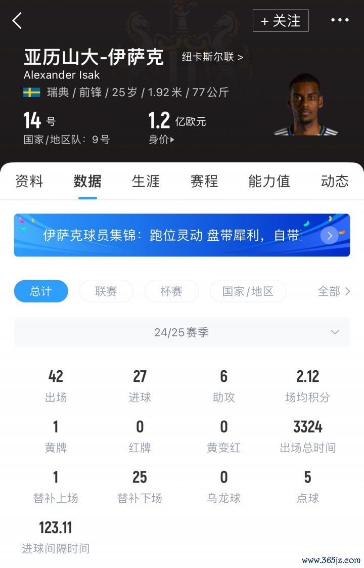 伊萨克时年25岁,瑞典时尚。上赛季他为纽卡出场42场,赢得27球和6次助攻,当今其德回身价为1.2亿欧。