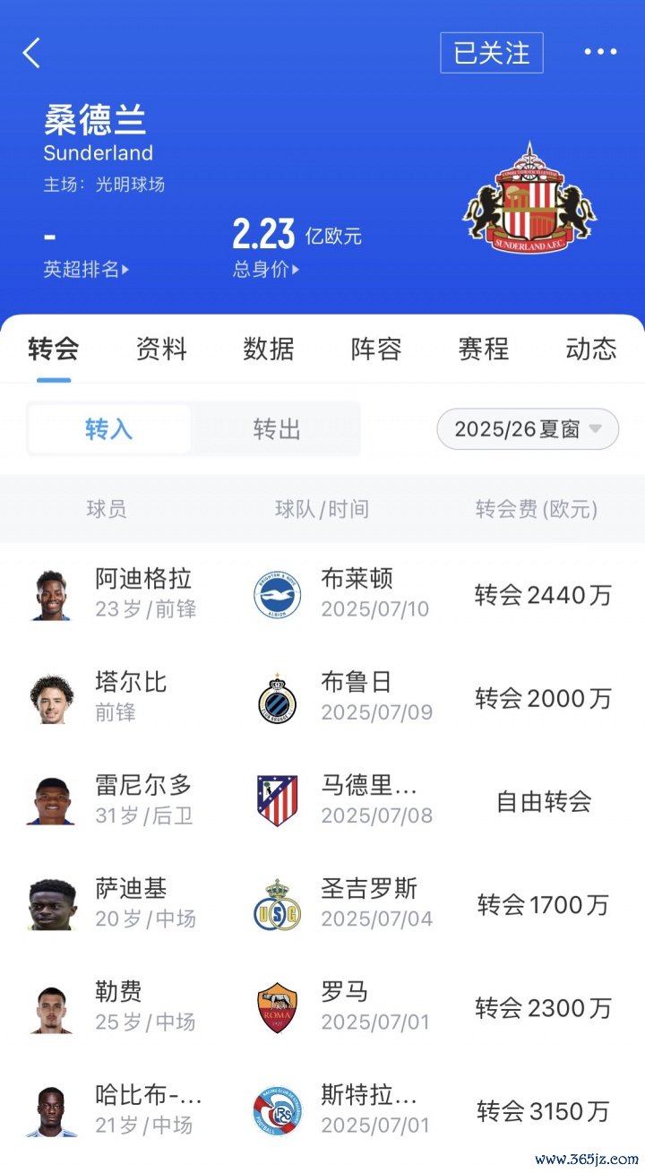 桑德兰今夏的引援支拨已达到1.159亿欧引进6东谈主,在英超排行第7,仅次于传统的BIG6。