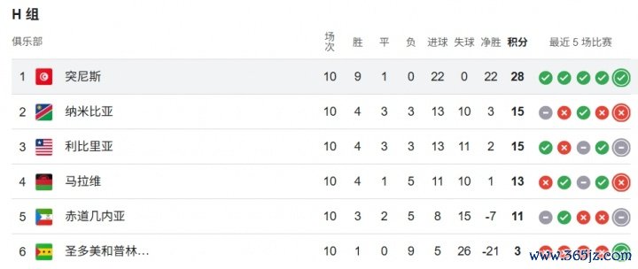 10月13日讯 世初赛非洲区小组赛H组今天戒指了临了一轮的一起较量,最终突尼斯以10轮28分,进22球失0球的无解战绩小组第一收官。