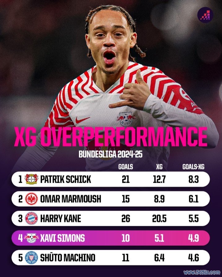 你的位置:意大利杯直播 > 中超直播 > 哈维-西蒙斯上赛季联赛骨子进球比预期进球多4.9个,德甲球员第四