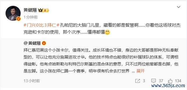 10月26日讯 拜仁本轮3-0十东谈主门兴,赛后,黄健翔发文点评。