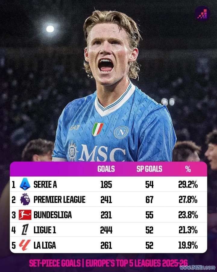 10月30日讯 Opta数据统计了本赛季五大联赛的定位球进球数占比,意甲位列第一。