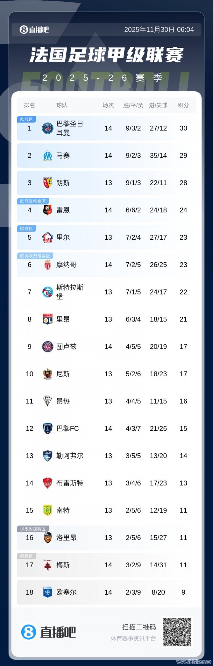 你的位置:意大利杯直播 > 中超直播 > 法甲积分榜:前二巴黎、马赛皆刹车!朗斯若明晨赢球可赶走登顶